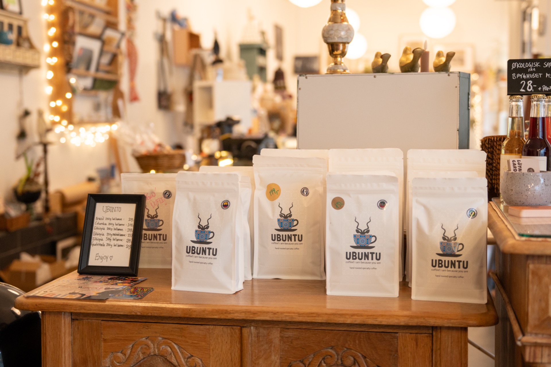 Vi er de stolte forhandlere af nogle Ubuntu Coffee's lækre bønne-varianter. Hos os kan du blandt købe Brasil, Ethiopia, Guatemala varianterne. Alle varianter fåes i 250 grams poser, og enkelte varianter fåes også i 500 grams poser. Priser fra 109 kr/pose. Som noget helt unikt, kan du også nyde en kop dejlig kaffe i mange varianter hos os. Pris 25 kr/kop, uanset variant.