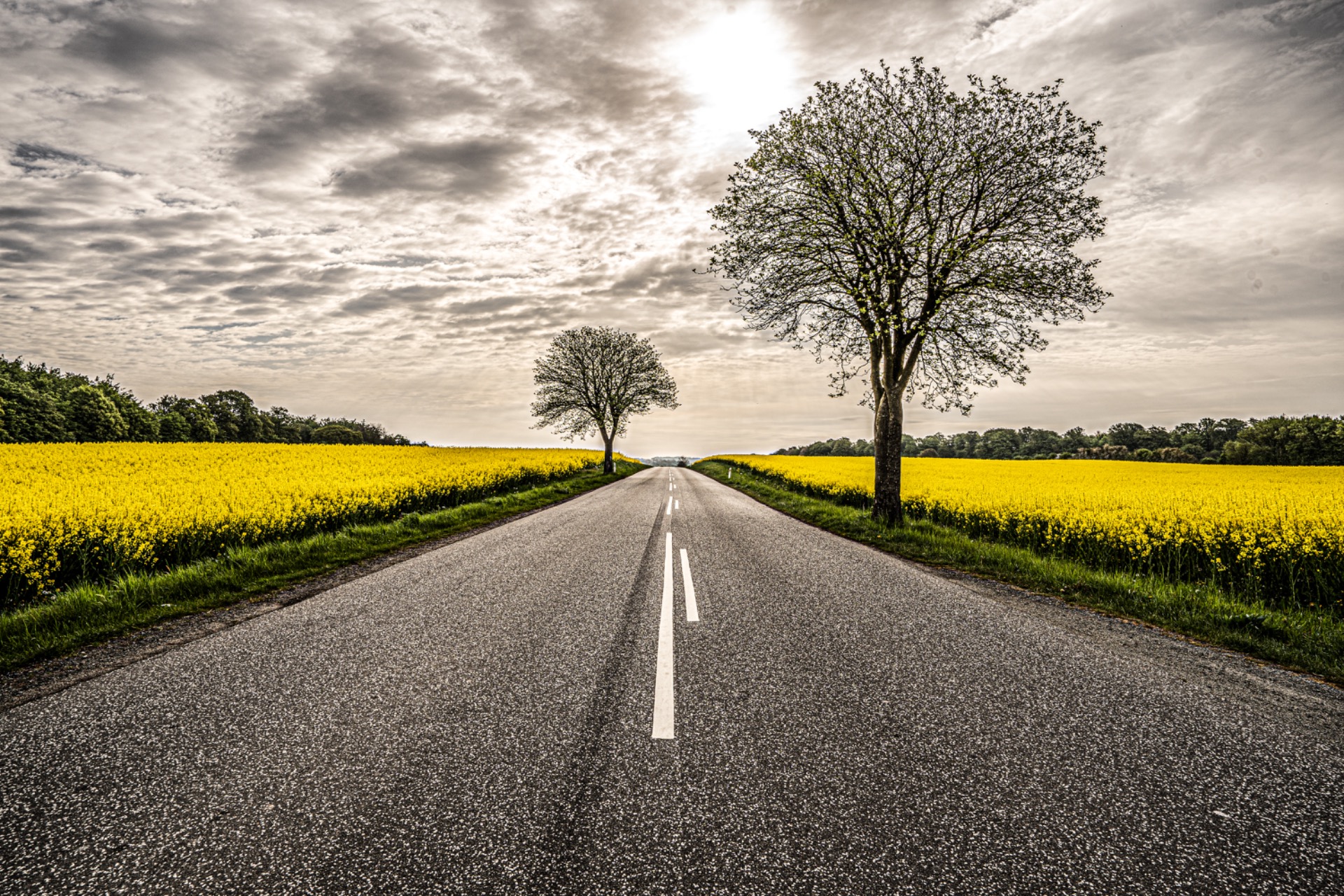 Smukt billede af landevej, omgivet af rapsmarker. Billedet er ikke på lager. Kontakt os for bestilling. Billedet kan leveres indenfor 10 hverdage, direkte til din adresse.